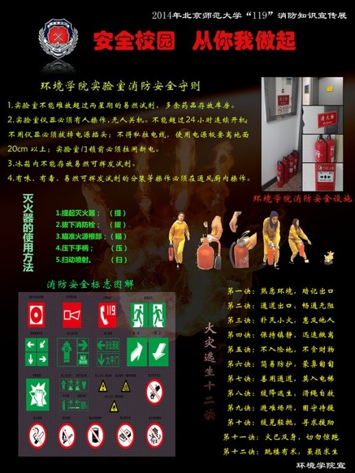 在院分党委的指导下、公司师生代表的支持下,部门工会成员群策群力,从公司消防特色——实验室消防安全这一角度入手,展示公司在消防守则规范、设施配 备、危机预演等方面的成绩。同时在展板中向观者普及消防安全标志图解、火灾逃生口诀等消防安全知识,以达到构建平安校园、提高师生安全消防意识的宣传目 的。展览中,公司宣传展板获得评委和广大师生的一致好评,荣获一等奖。