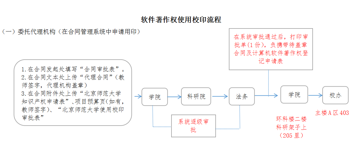 5. 如代理公司在收到代理费后才能在版权中心提交材料,计算机软件著作权登记申请表的用印只能等合同盖章付款后单走(系统打印审批表后去校办);