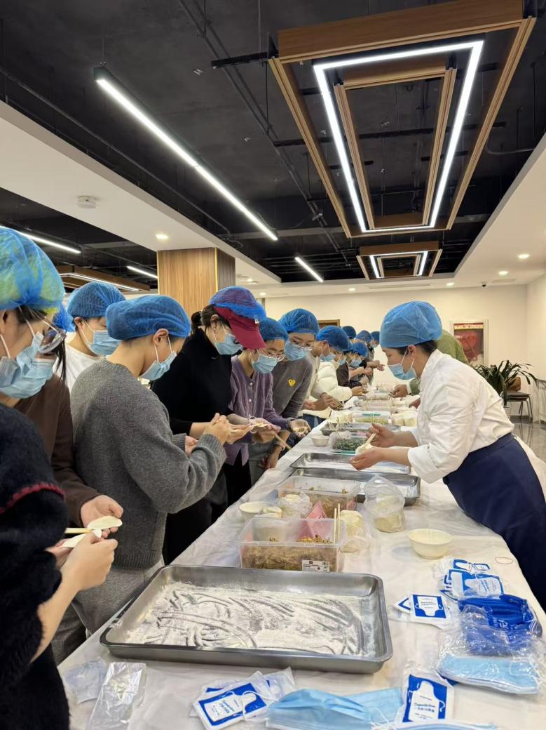 活动伊始,食堂工作人员提前备齐新鲜食材与工具,现场进行专业示范,细致讲解擀皮手法、包馅技巧及煮制要点,帮助同学们快速掌握操作要领。随后,师生们自发分组,填馅、捏合、塑形,动作有条不紊又充满创意。