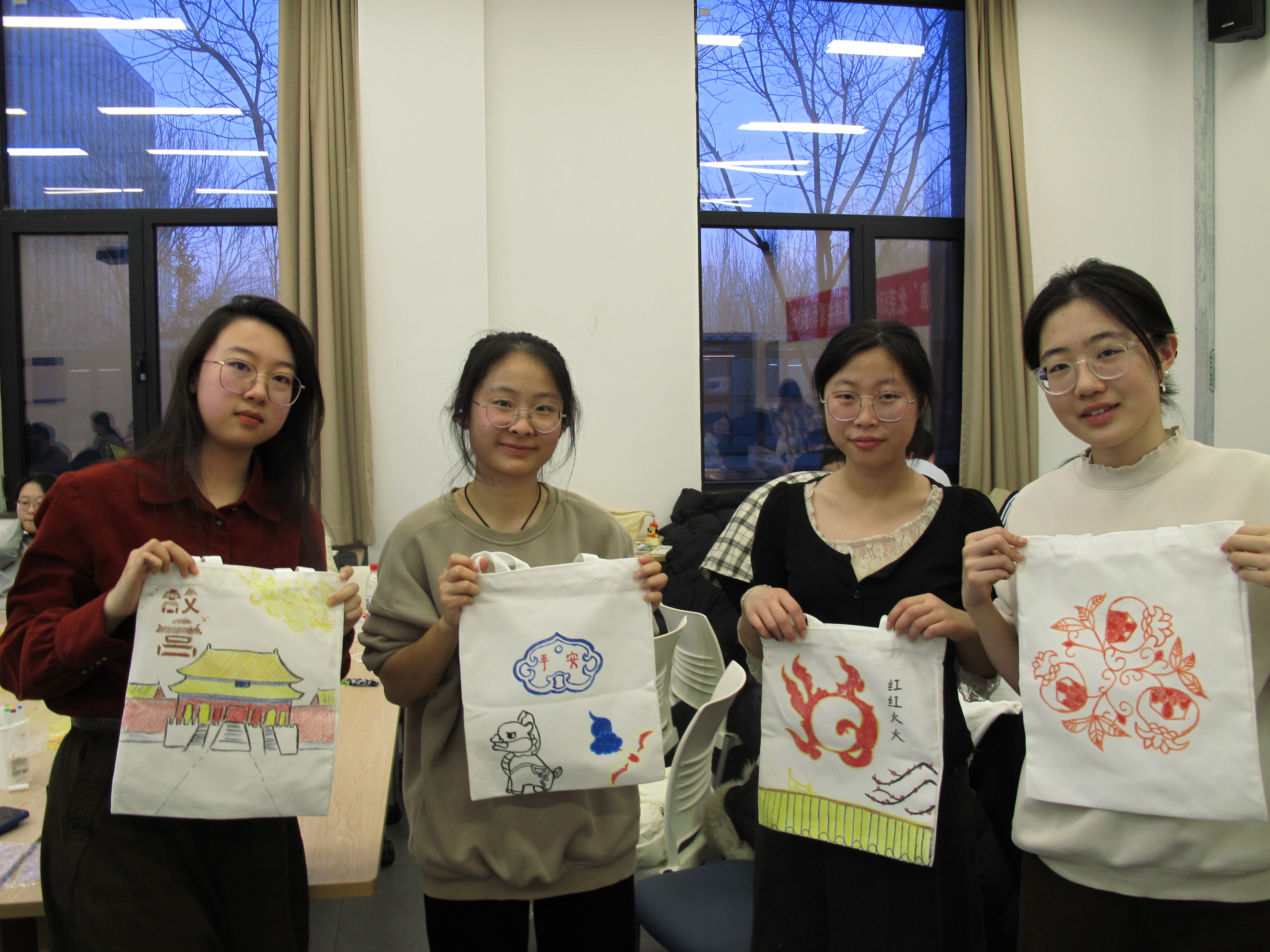 随后开展的是帆布袋创意涂鸦环节,活动现场准备了多种故宫经典纹样素材,供同学们自由挑选与参考。同学们根据个人兴趣选择自己喜欢的特色故宫元素,结合自身想法进行绘制。参与者们充分发挥自身的匠心巧思让传统纹样在帆布袋上焕发出新意与朝气。