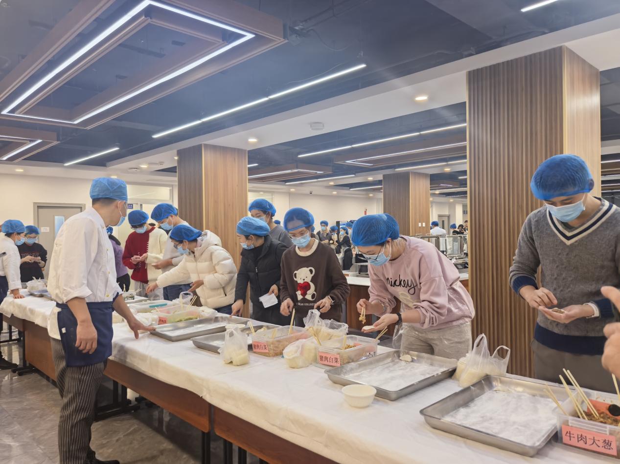 活动伊始,食堂工作人员提前备齐新鲜食材与工具,现场进行专业示范,细致讲解擀皮手法、包馅技巧及煮制要点,帮助同学们快速掌握操作要领。随后,师生们自发分组,填馅、捏合、塑形,动作有条不紊又充满创意。