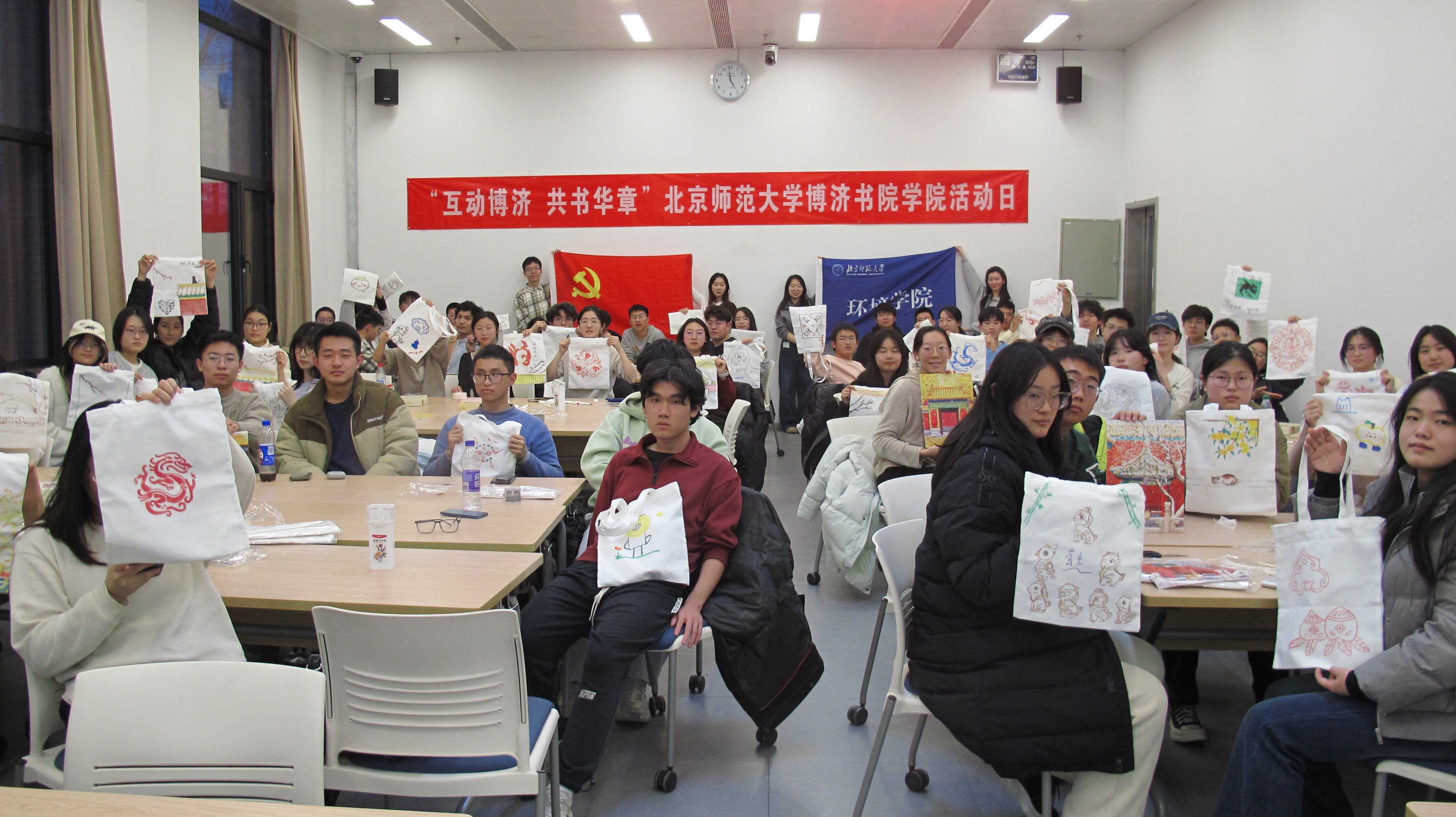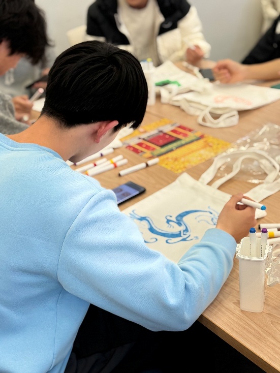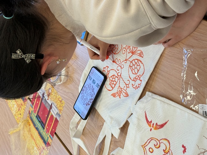随后开展的是帆布袋创意涂鸦环节,活动现场准备了多种故宫经典纹样素材,供同学们自由挑选与参考。同学们根据个人兴趣选择自己喜欢的特色故宫元素,结合自身想法进行绘制。参与者们充分发挥自身的匠心巧思让传统纹样在帆布袋上焕发出新意与朝气。