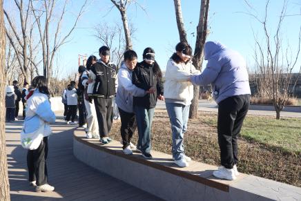 黑暗固然让人恐惧,但因身旁有你,使我敢于继续前行。本轮游戏中一名同学扮演“盲人”角色,另一名同学扮演“哑巴”角色,相互扶持,走过一段长长的无声之旅,起初互不相识的同学,此刻也显得默契无限。